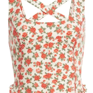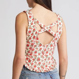 Charm Tops Lady Scoop Neck Corset Crossover Strap Ruffle Hem Rose Floral Tank Top Casual Women’s Tank