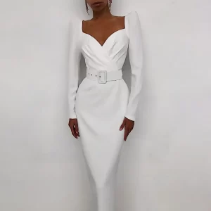 2024 Autumn Full Sleeve V-neck Shirred Waist Band Women Party Elegant Lady Casual Slim Long Dresses