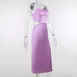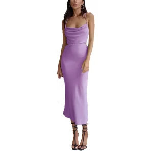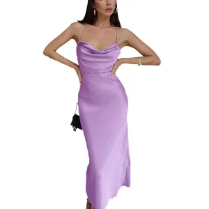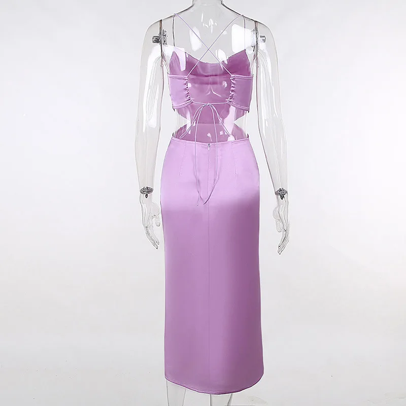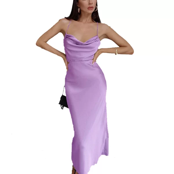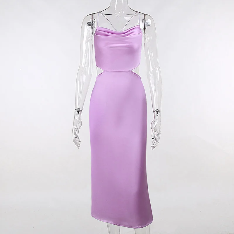 2024 Plain Color Square Neck Spaghetti Straps Backless Slim Sexy Women Casual Polyester Satin Dresses