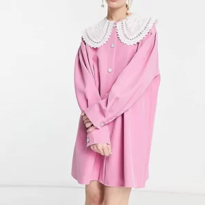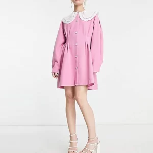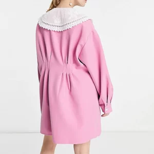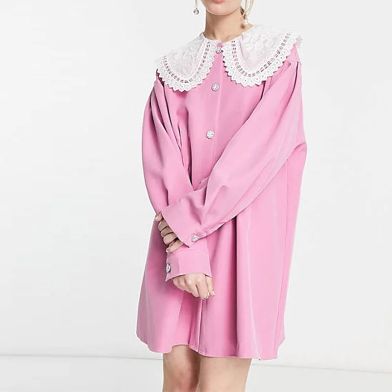 Casual Fall Style Elegant Petite Lady Long Sleeve Lace Collar Cinched Waist Loose Solid Button Women Mini Dress