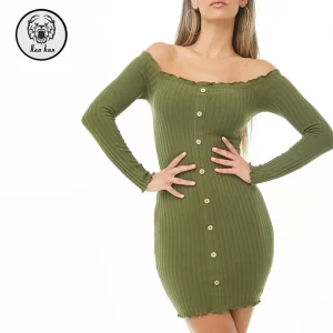 Clothes Women Off The Shoulder Ribbed Mock Button Breathable Sexy Bodycon Mini Dress