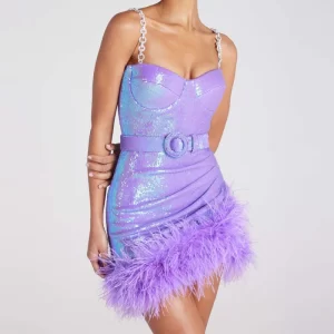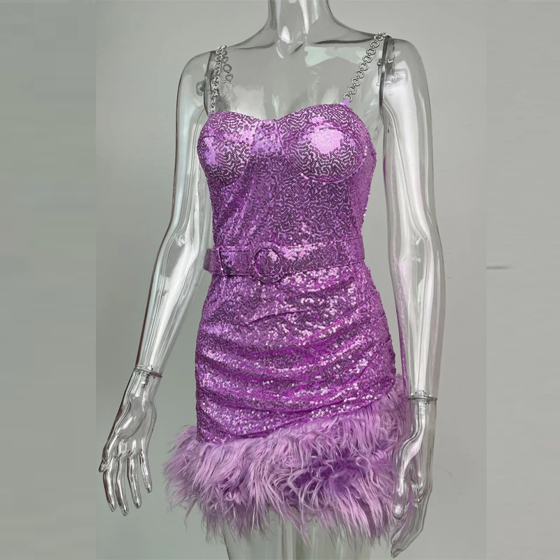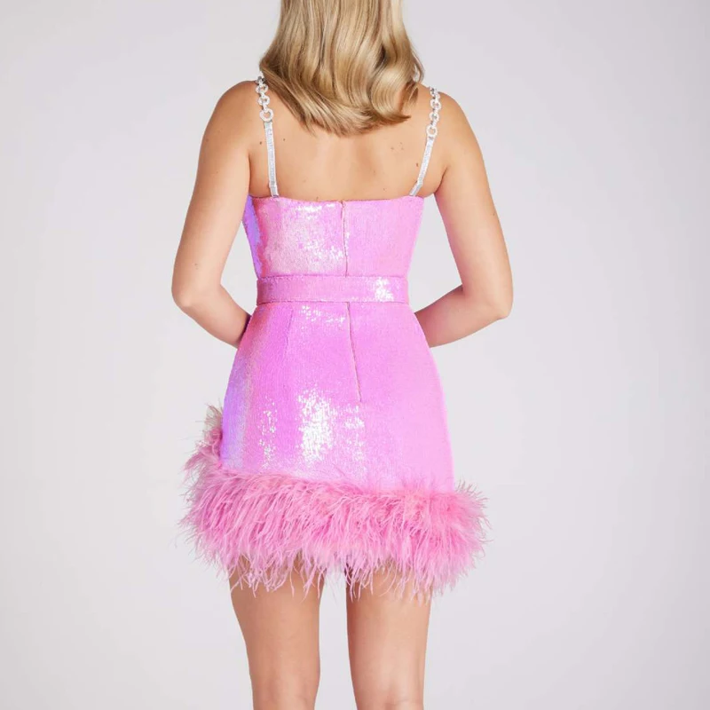 Design Pink Sleeveless Waistband Feather Hem Women Sexy Casual Sequin Evening Dresses