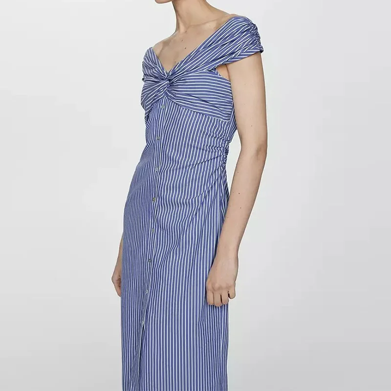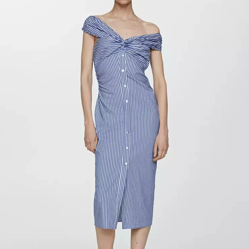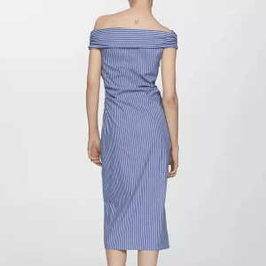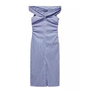 Elegant Office Style Front Button Midi Dress with Striped Bare Shoulders Slim Fit Women’s Dresses
