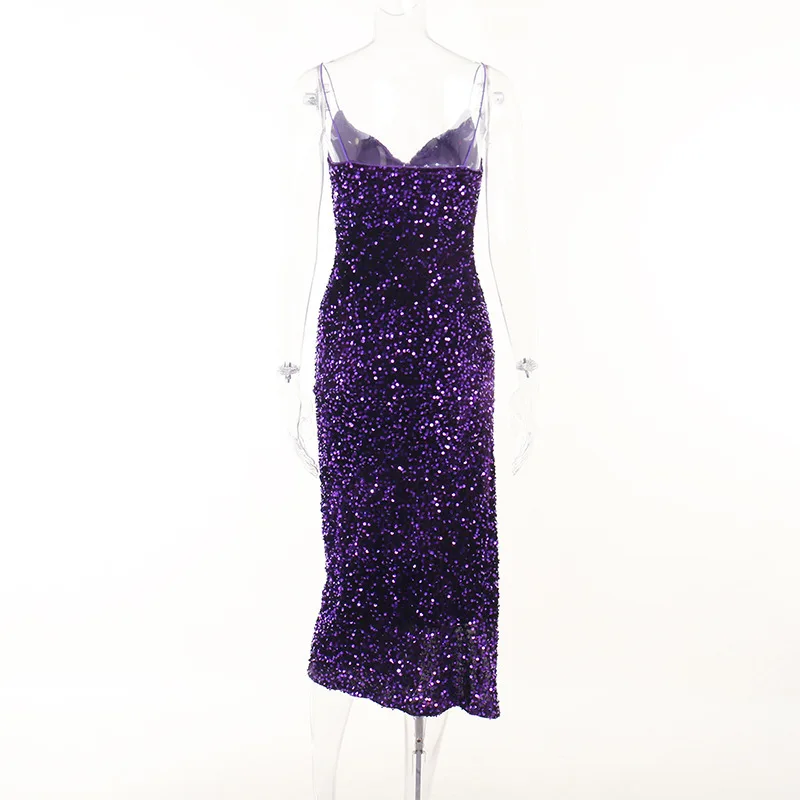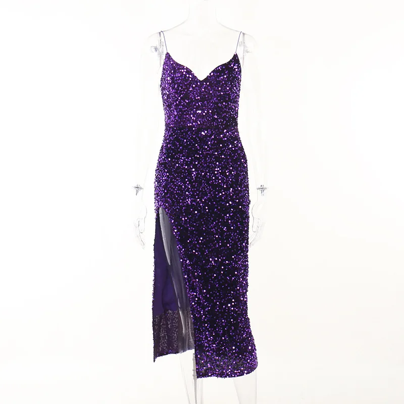 Fashion High Slit Sleeveless V-neck Party Elegant Women Sequin Evening Formal Dresses