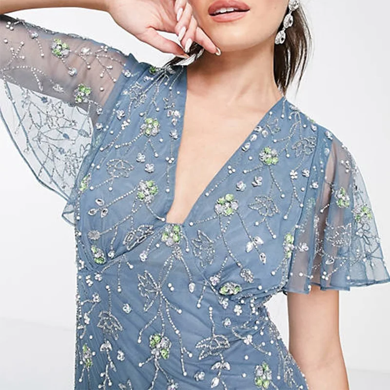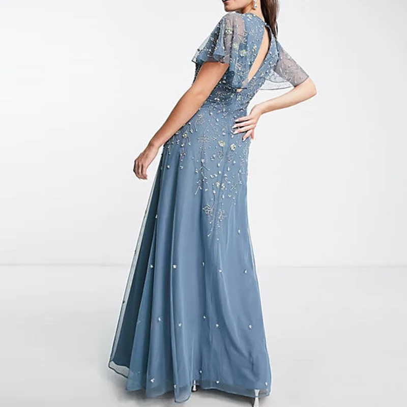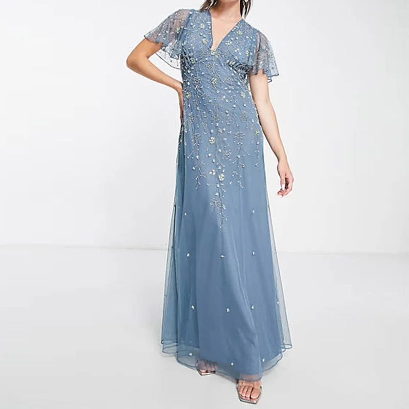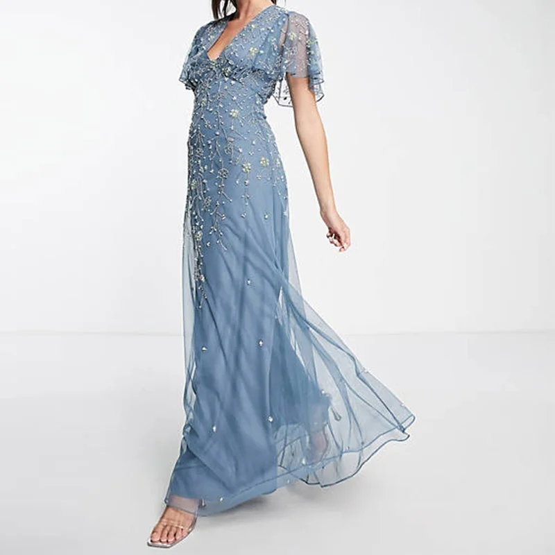 New Bridesmaid’s Solid Blue Flutter Sleeve Trailing Floral Embellishment Tulle Breathable Slim Maxi Dress